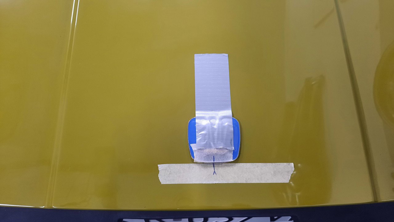 Dostałem też reprodukcję znaczka na maskę, któego ten egzemplarz nie miał, jak do mnie przyjechał. Przykleiłem taśmy na samochód i na znaczek, a następnie wymierzyłem środek i auta i znaczka.