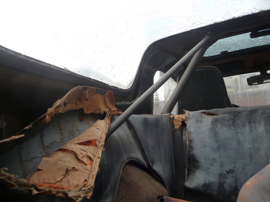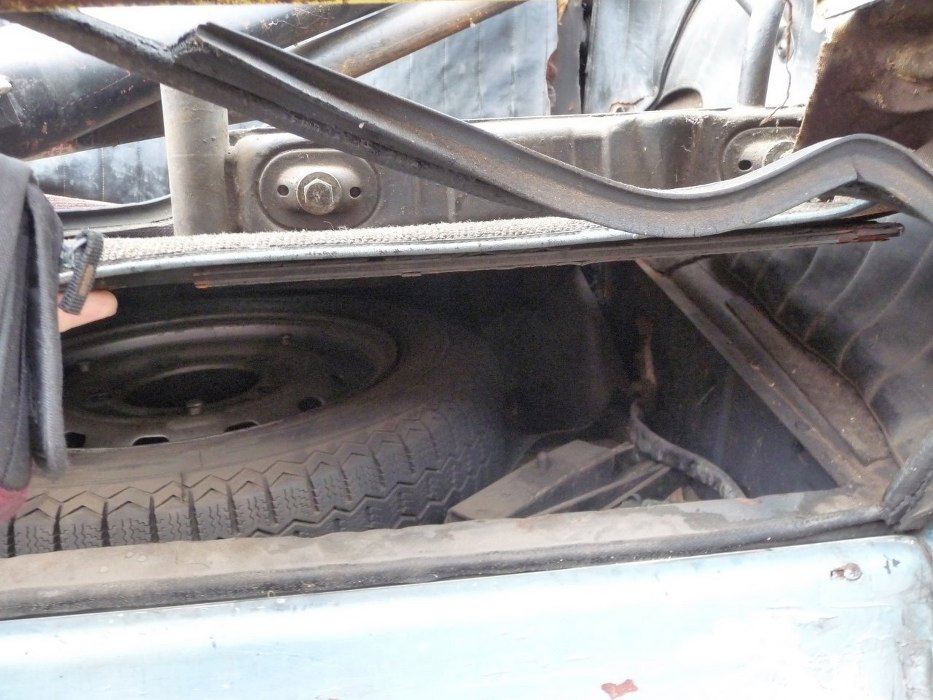 Widok od środka bagażnika. Widać pałąk antykapotażowy. Tapicerka w mocno zdegradowanym stanie.