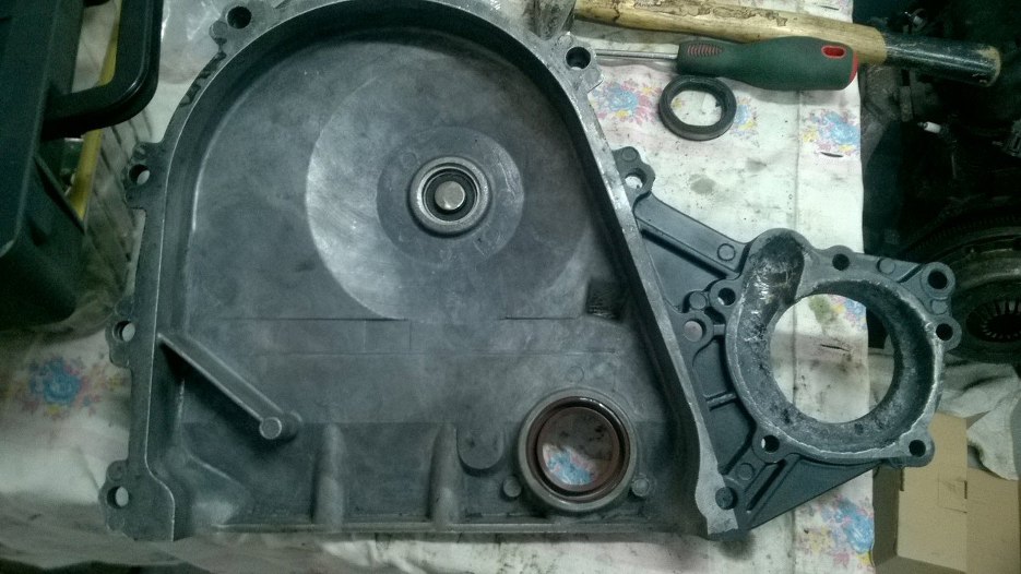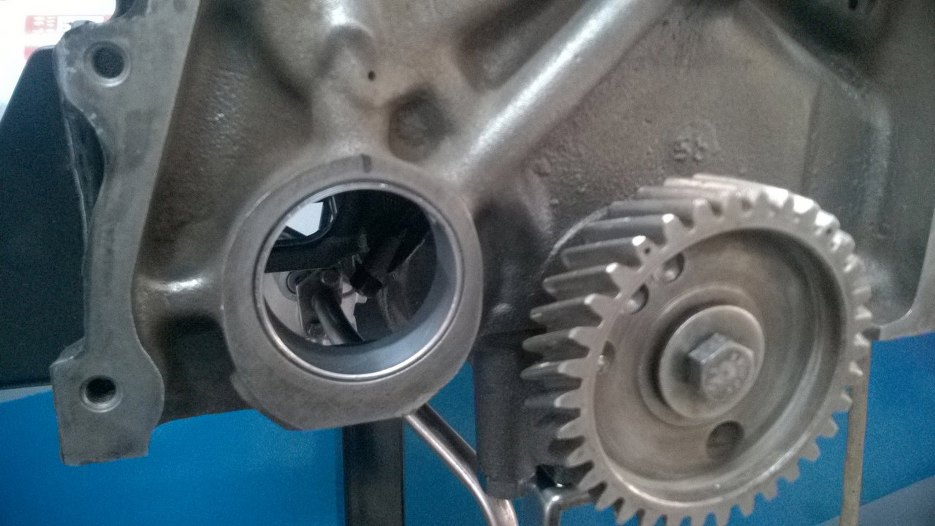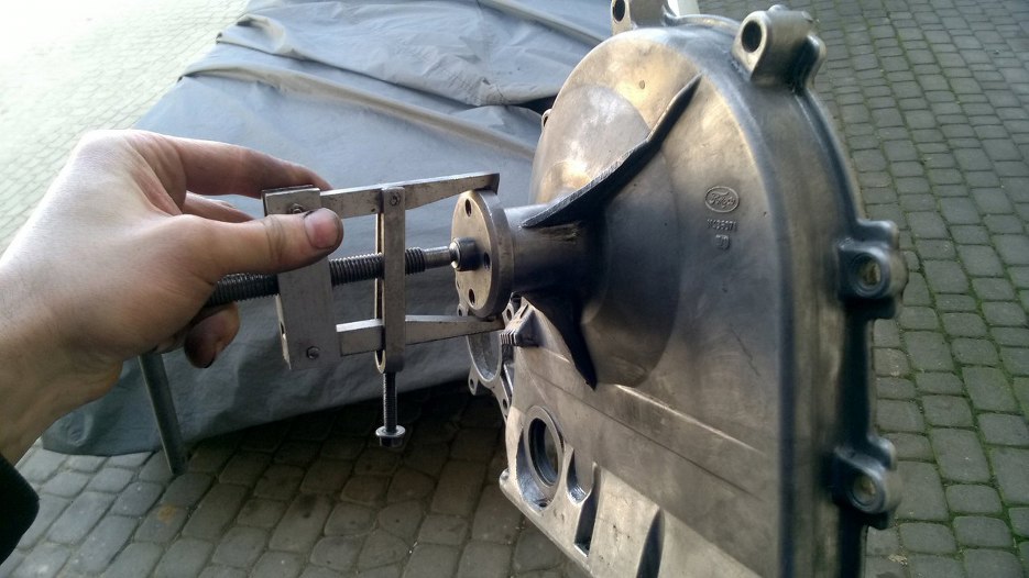 Łożysko wyjęte. Okrągła zaślepka widoczna na zdjęciu występowała w najstarszych silnikach. Powyżej pewnego numeru silnika Ford z niej zrezygnował i jest adnotacja w serwisówce, żeby jej nie wkładać z powrotem.