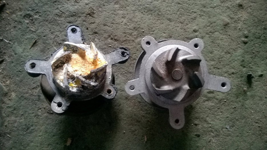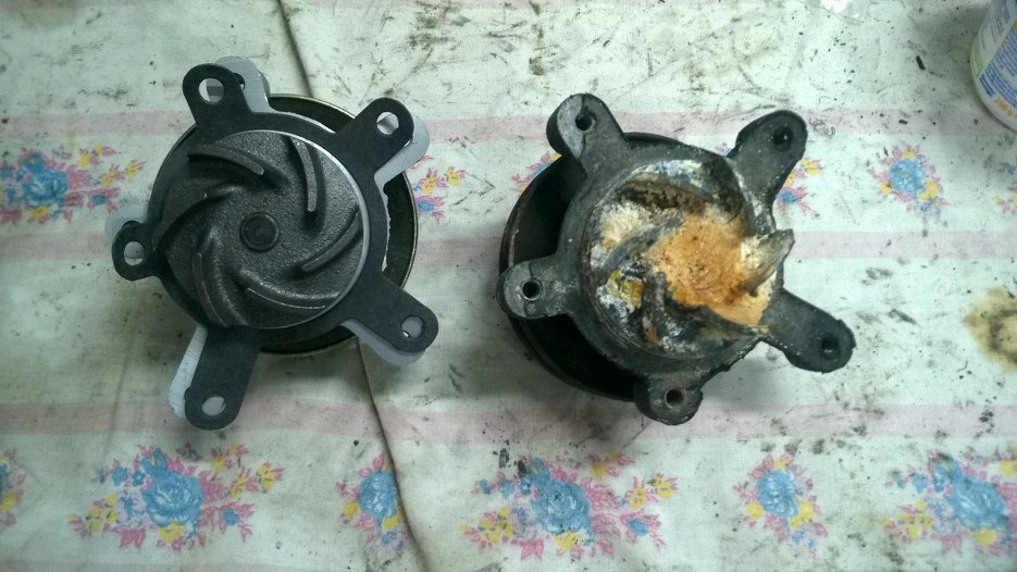 Pompa wody na początku też przyszła nie taka jak trzeba - po lewej jest właściwa dla V4, po prawej - od V6. Niby takie same, a kręcą się w różne strony...
