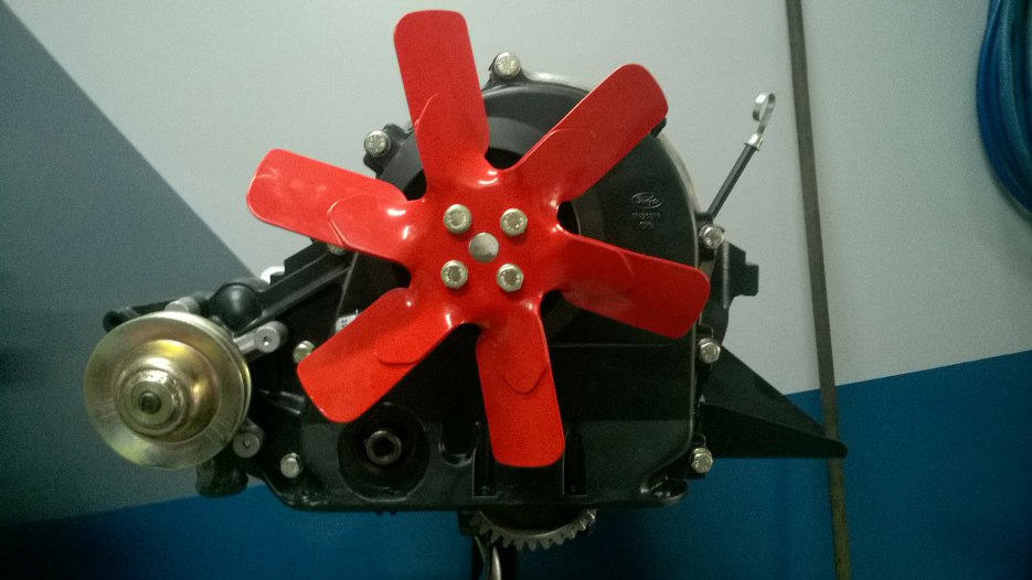 Następnie przykręciłem koło pasowe i wiatrak. I tu się okazało dlaczego żeberka obudowy łożyska były zeszlifowane - koło obciera, bo jest krzywe (na szczęście lekko)... a ktoś podpiłował obudowę rozrządu :(. Nie chciałem piłować bardziej, więc zaznaczyłem obcierające miejsca krzywego koła i wyprostowałem je na prasie.
