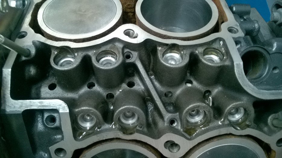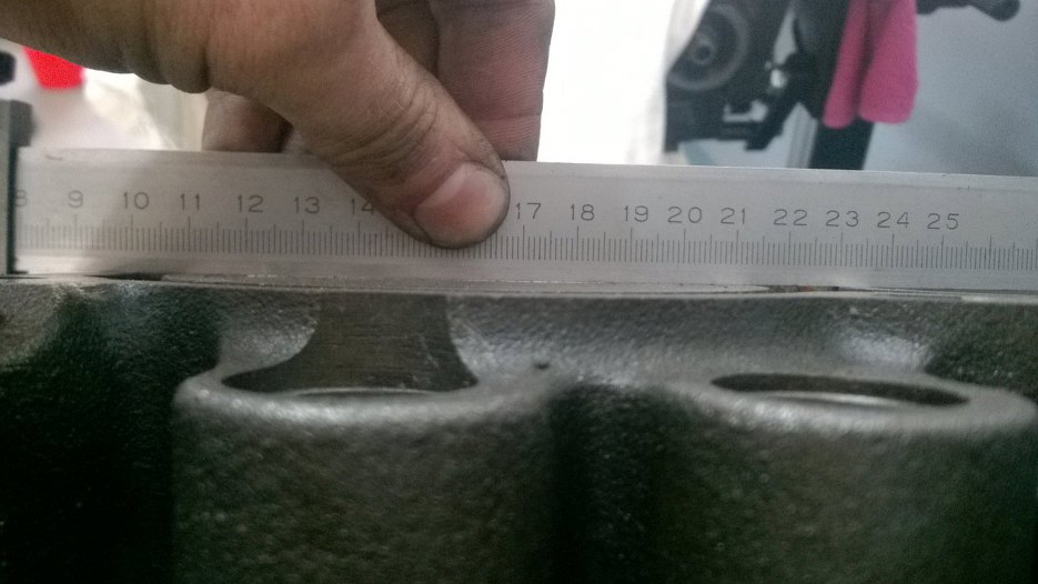 Wracam do wymyślania geometrii silnika. Sprawdziłem, czy blok jest dobrze zeszlifowany. Jest. Płaszczyzna bloku jest równo z blokiem, żadnego listka szczelinomierza nie daję rady tam wcisnąć, a mam takie poniżej 0.05mm grubości :). Najlepsze jest to, że jedną stronę tzreba było zeszlifować 0.30mm, żeby była równa (tak!), a druga była wtedy wyższa o 0.80mm! Taka dokładność była w fabryce. Teraz obie strony bloku są równe.
