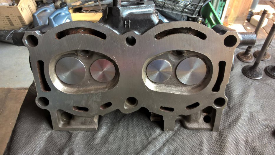 Głowice. Temat w sumie rzeka... Skrócę więc. Zawory były do kitu. Skoro i tak trzeba wymieniać, to wziąłem leżące pod ręką zawory od nowszej V6 Forda, 2.3l. 2.3 V6 i 1.7 V4 mają te same typoszeregi części. Nowsza V-ka ma nieco większe zawory - o jeden czy dwa milimetry. Zawsze coś. Nie chciałem wkładać tu zaworów od 2.8 V6, któóre się co prawda mieszczą, bo wtedy nie da się wstawić twardych gniazd zaworowych. A to jest fajna rzecz, jak nie trzeba regulować zaworów co chwilę. Na zdjęciu widać po lewej stare zawory, po prawej nowe.