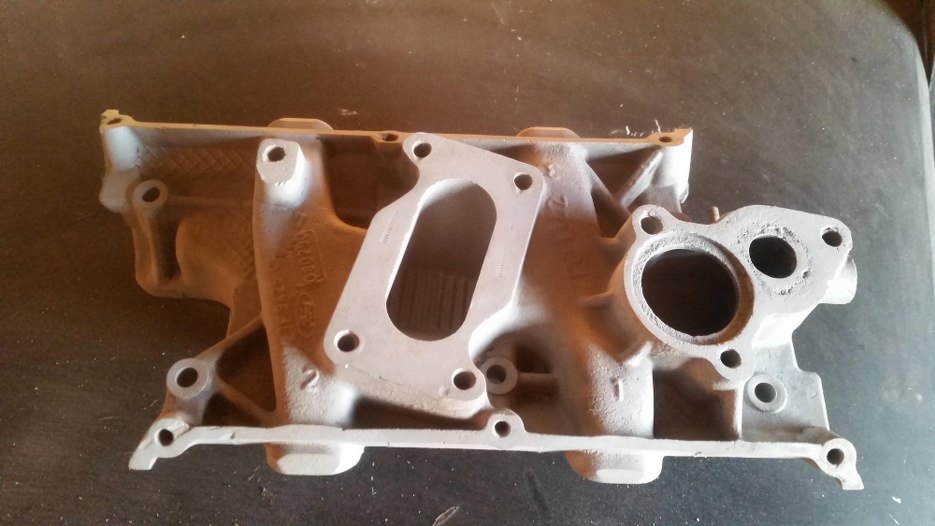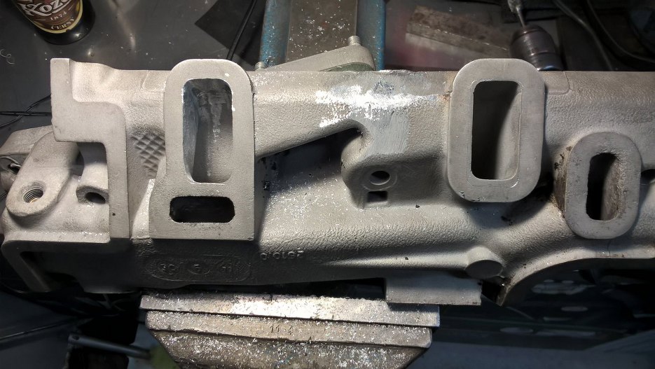 I przykręciłem kolektor. Przy jakiejś wcześniejszej okazji wyregulowałem też zawory. Kolektor pomalowałem na czarno, żeby pasował do silnika. Oryginalny kolektor miał ślady farby, ale niebieskiej, takiej, jak powinna być na pokrywach zaworów. Nie pasowało mi to do standardów Forda, więc ustaliliśmy z właścicielami, że zostawiamy czarny kolektor.