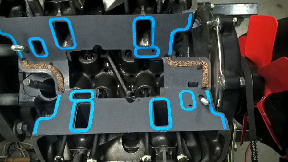 Przyłożyłem teraz uszczelkę kolektora dolotowego. Widać, że nie bardzo pasuje pośrodku. Blok był odrobinę planowany, nie spodziewałem się, że może to spowodować aż taki rozjazd przy tej uszczelce. Dlatego całą środkową część po prostu wyciąłem.
