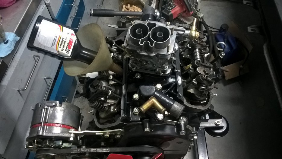 Dokręciłem korek spustowy oleju w misce olejowej (tak, pamiętałem, żeby zrobić to najpierw :) ) i nalałem olej. Najpierw jednak wlałem dodatek Comp Camsa z dodatkiem cynku.