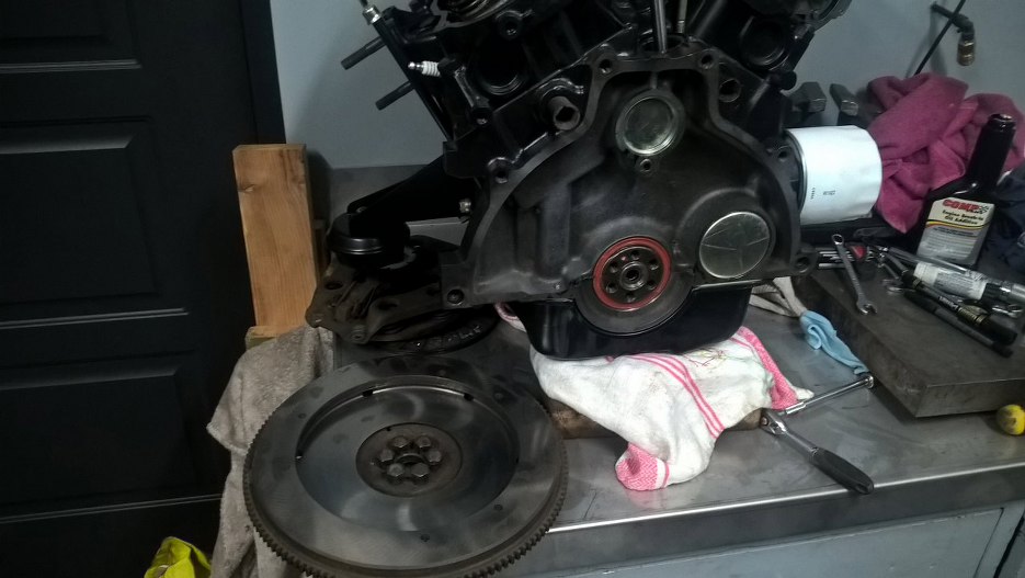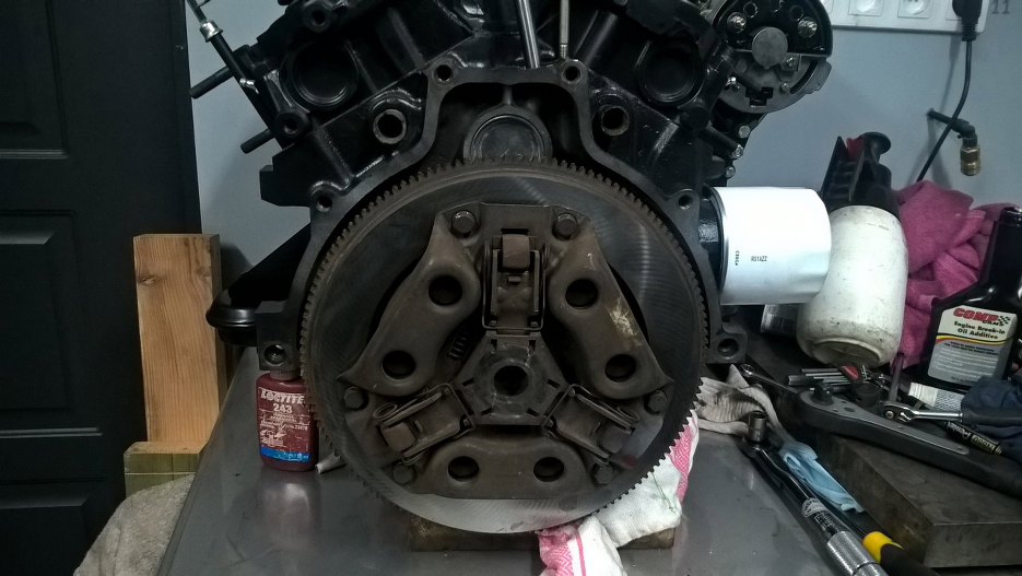Następnie silnik zdjąłem już ze stojaka, żeby dostać się do jego tylnej części. Przygotowałem koło zamachowe i sprzęgło.