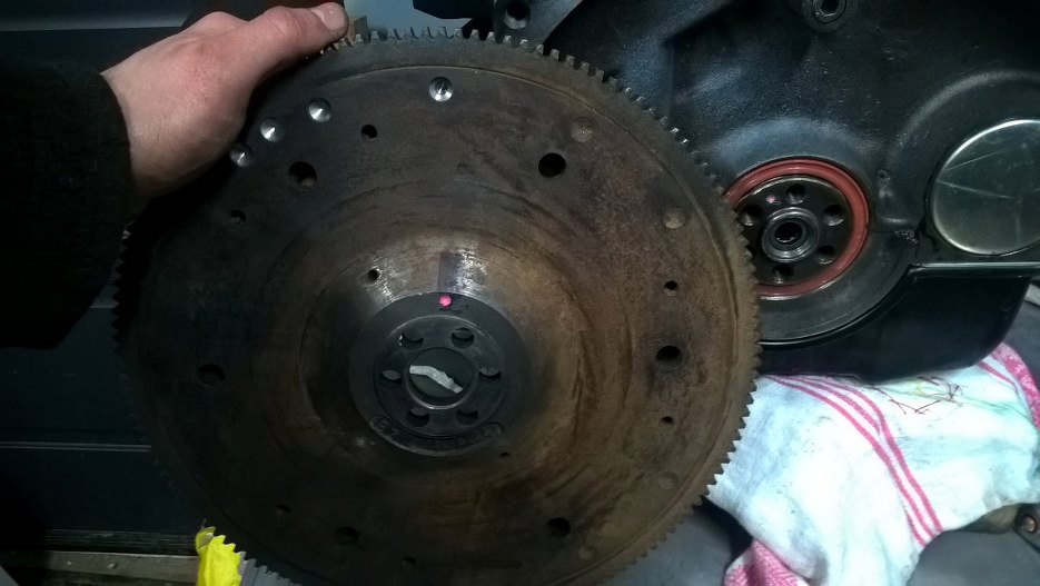 Koło zamachowe było wyważone razem z całym układem korbowo-tłokowym. Widać czerwoną kropkę nabitą koło śrub mocujących. Analogiczna kropka jest na wale korbowym. Wiadomo co z nimi należy zrobić... Widać też nawiercone otwory w kole zamachowym, którymi uzyskane było wyważenie.
