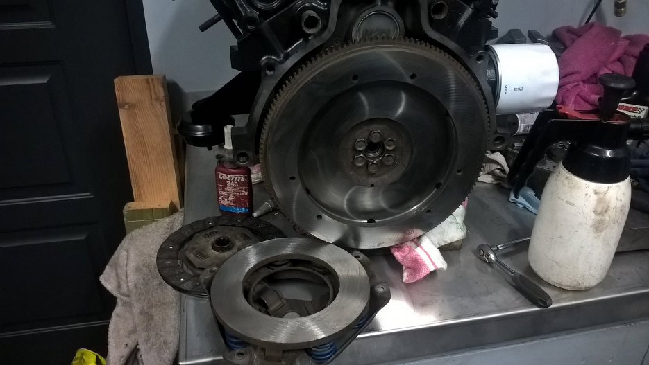 Sprzęgło złożone. Tarcza sprzęgła miałą nabite nowe okładziny. Ponieważ nie bardzo było tu jak manewrować rozmiarem tarczy, a jednak silnik jest trochę mocniejszy niż był, to została nabita okładzina z kevlarem. Może i niedużo to dało, ale raczej prędzej zmielimy skrzynię biegów niż sprzęgło. Ale o tym później...