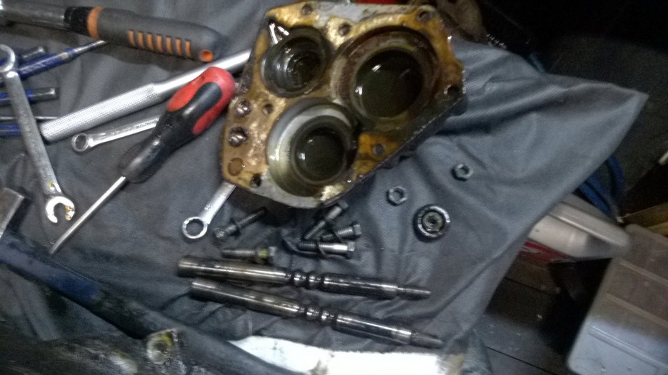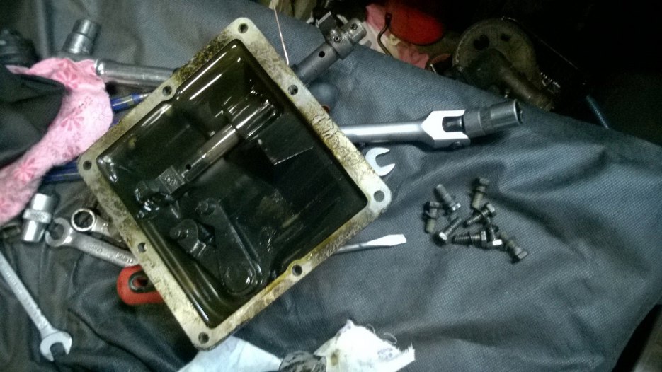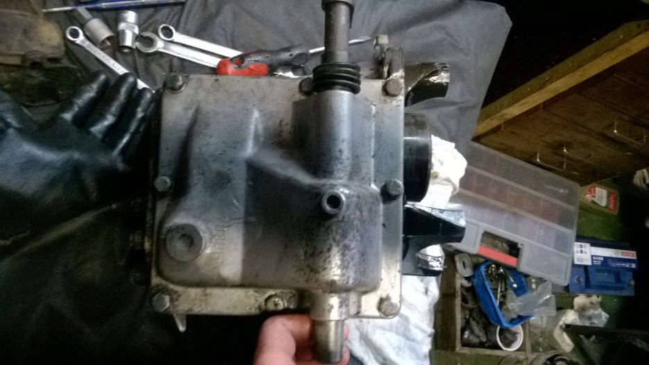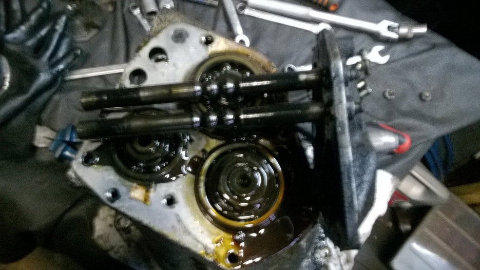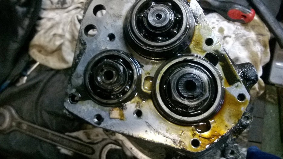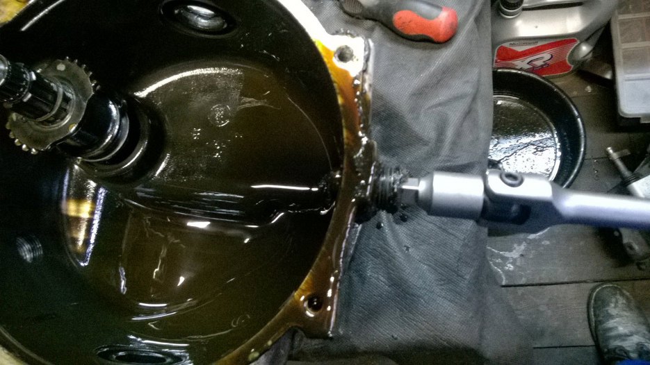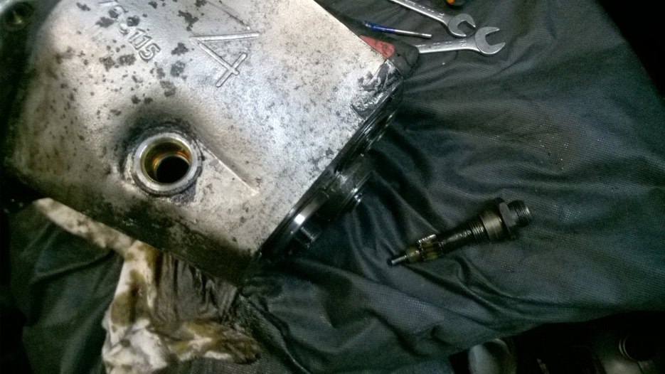 W środku szlam ze starego oleju. I to gruby. Wystająca ośka po lewej to wałek wejściowy ze skrzyni, a te ząbki na nim to fragment mechanizmu wolnego koła. Jak widać odkręciłem korek oleju.
