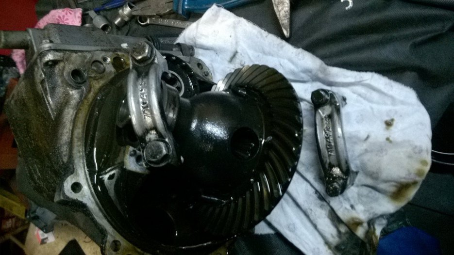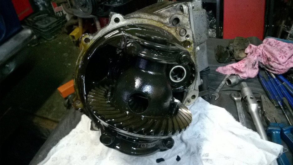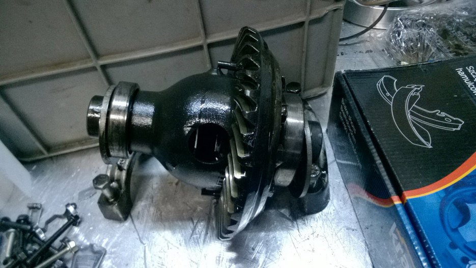 Mechanizm różnicowy też cały w szlamie olejowym, ale wygląda nieźle.Po prawej stronie wystaje druga część mechanizmu wlnego koła, z której idzie dalej napęd na srzynię biegów.