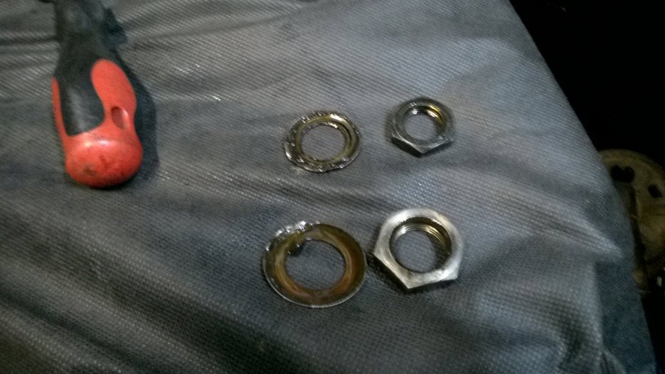 Nakrętki były zabezpieczone przed odkręceniem zagiętymi podkładkami z ząbkiem, ale ząbek już właściwie nie istnieje. Te podkładki już się nie nadają do użycia.