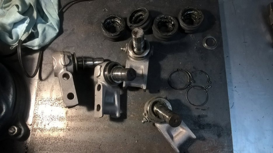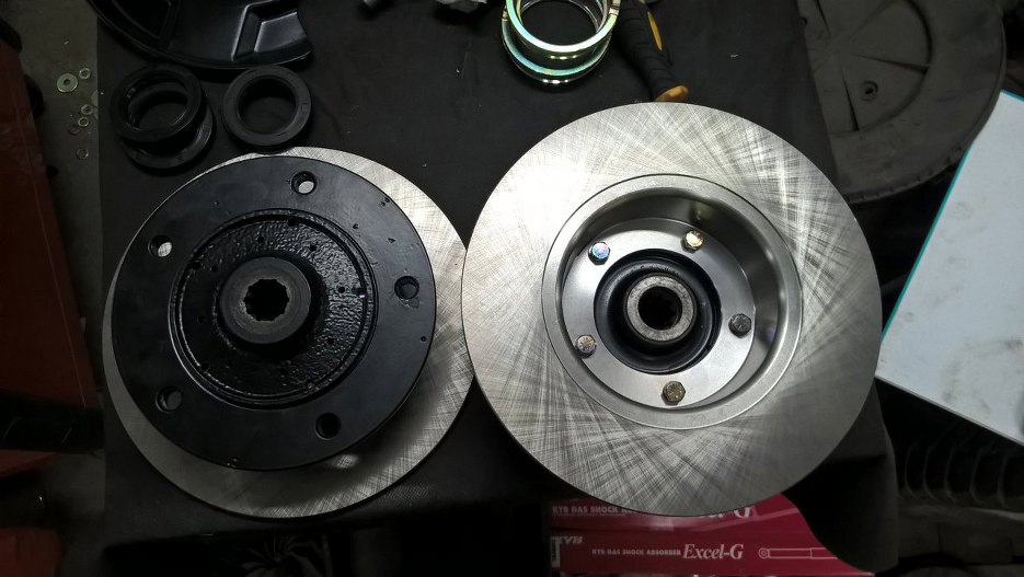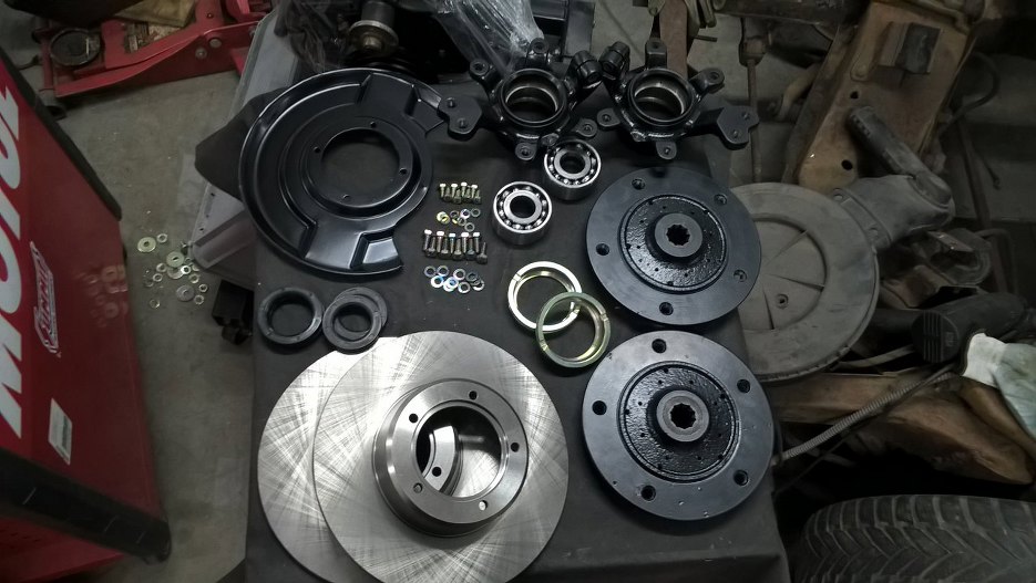 Odnowione zostały też wszystkie elementy składowe zwrotnic. Łożyska z dużym trudem udało mi się domyć ze starego smaru, a ponieważ były w stanie idealnym, to napakowałem je świeżym smarem i zostawiam na miejscu. Kupiłem też nowe simmeringi i tarcze hamulcowe.
