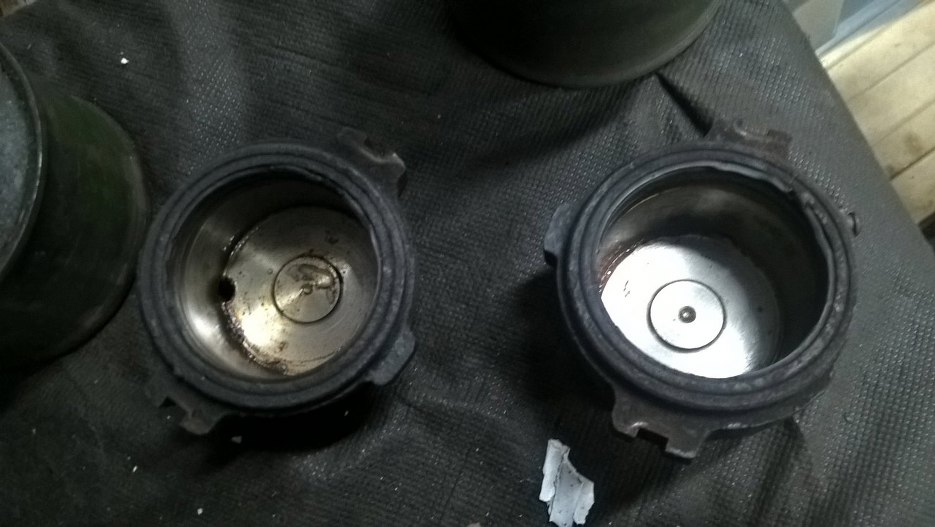 Obudowy tłoczków w środku. Widać, że gumki nie nadają się już do użycia.