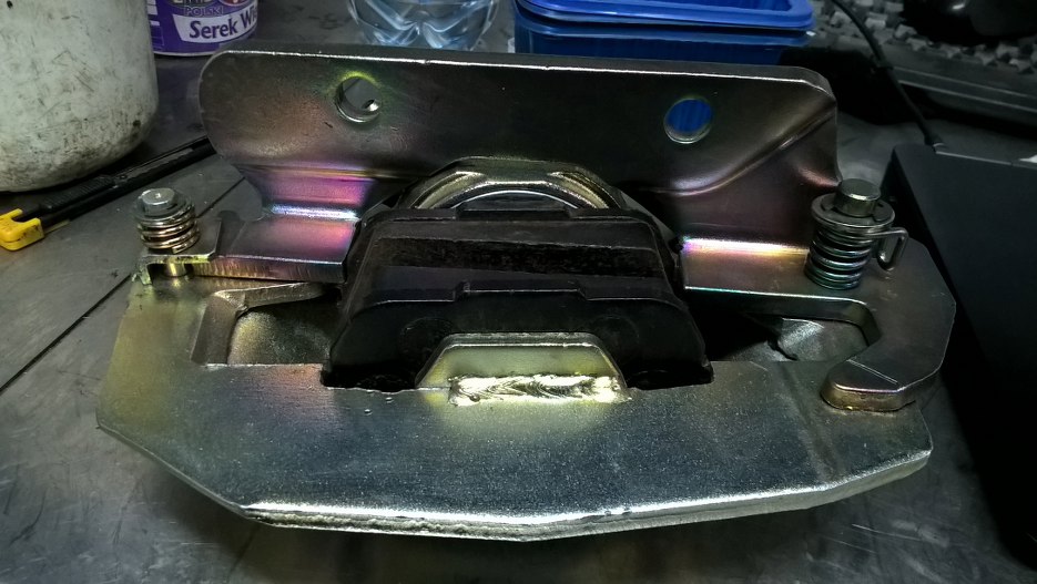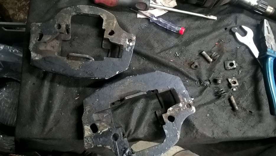 Zacząłem od wyjęcia klocków i zdjęcia blachy mocującej zacisk do zwrotnicy.