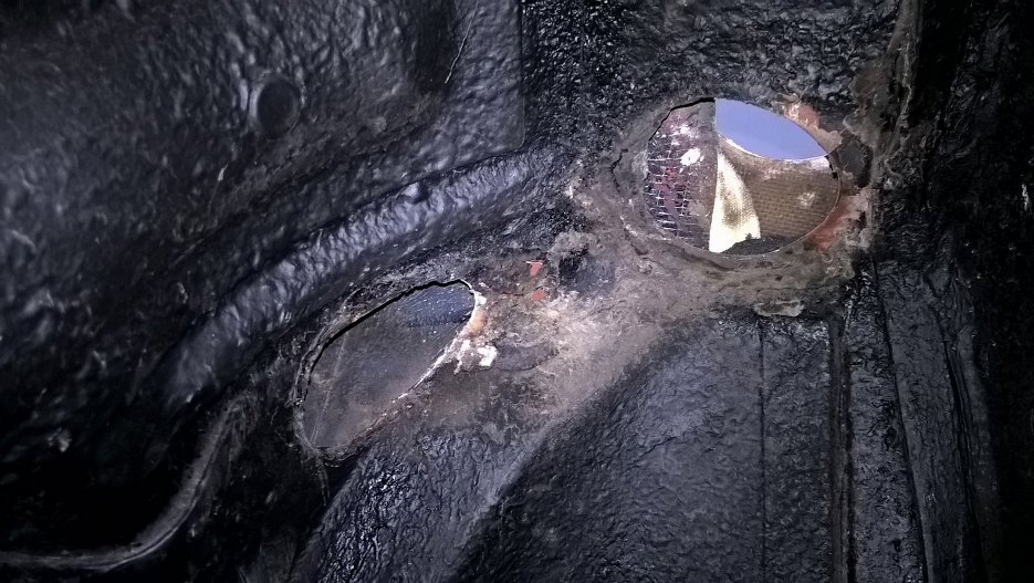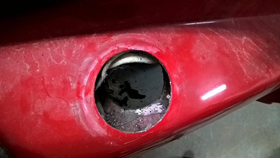 Ciekawa konstrukcja. Rura wlewowa wchodzi od góry w karoserię z laminatu, wychodzi do dołu przez już stalową część karoserii i wchodzi z powrotem do wnętrza. tu widoczne otwory na rurę w dolnej części auta.