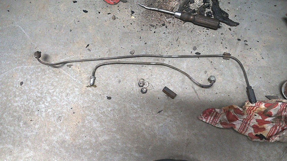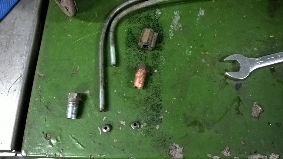 Nowe rurki, które kładłem wcześniej, mają jednak końcówki metryczne, i takie też dałem nowe złączki, więc odciąłem z tych starych rurek same końcówki. Wymienię je na nowe, metryczne, żeby wszystko do siebie pasowało. Końce tych starych zostawię calowe, żeby pasowały do wężyków elastycznych. Trochę może nieładnie mieszać dwa systemy miar, ale ktoś, kto do tego zajrzy po mnie, będzie to rozkręcał pewnie za 40-60 lat, więc będę wtedy udawał, że nie pamiętam o co chodzi :). Zresztą przy pompie hamulcowej są same metryczne końcówki, więc jestem trochę usprawiedliwiony :).