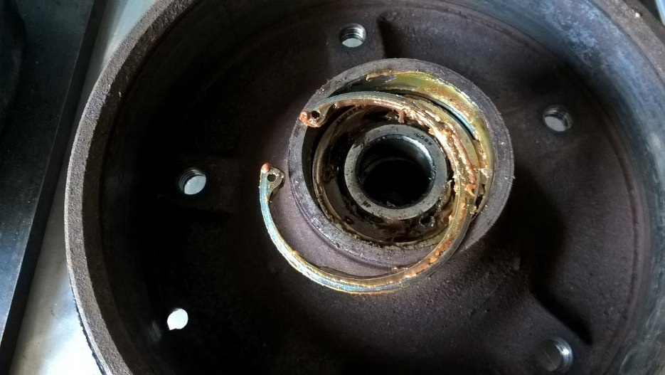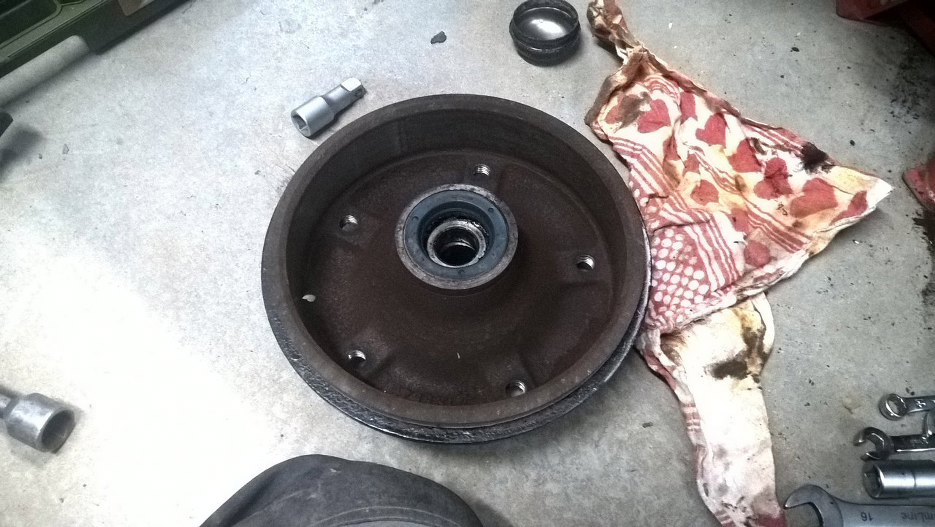 Następnie odkręciłem nakrętkę i zdjąłem piastobęben. Jeden zszedł od razu, drugi należało potraktować siłą. Ucieszyłem się, bo bębny są w bardzo dobrym stanie i nie trzeba będzie ich wymieniać.