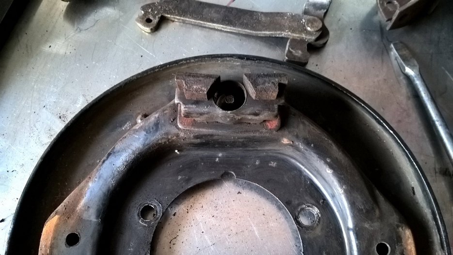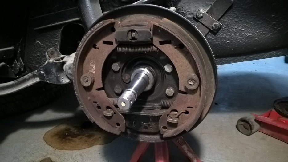 W środku nieźle, tragedii nie ma. Szczęki niedużo zużyte, ale z racji ich wieku, zostaną wymienione na nowe. Tu już zdjąłem cylinderek hamulcowy. Ciekawa konstrukcja, że cylinderek jest na dole, wynika to prawdopodobnie z tego, że pompa hamulcowa jest bardzo nisko w karoserii, a cylinderek dobrze by było, żeby był niżej niż pompa.