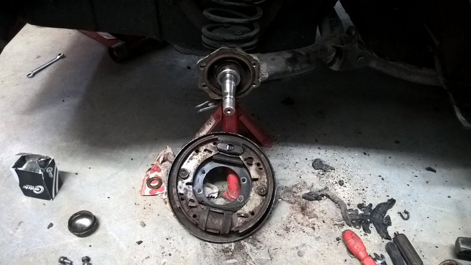 Odkręciłem cztery śruby trzymające tarczę kotwiczną do zawieszenia, odpiąłem też linkę hamulcową.