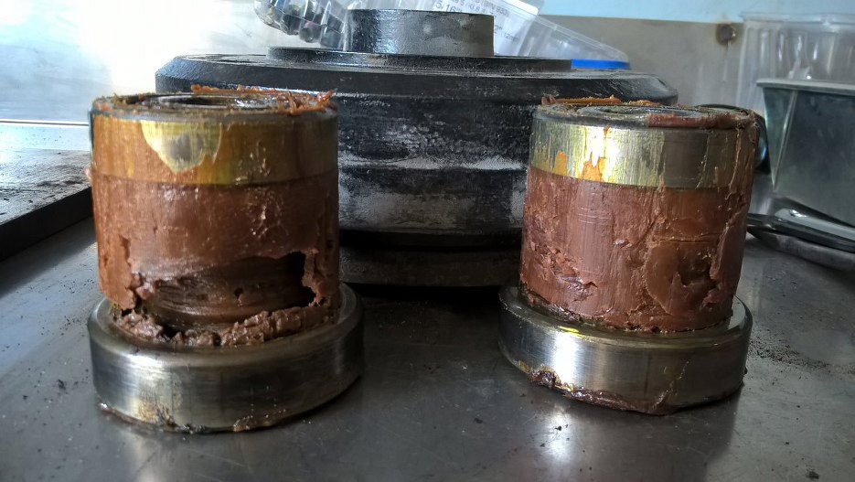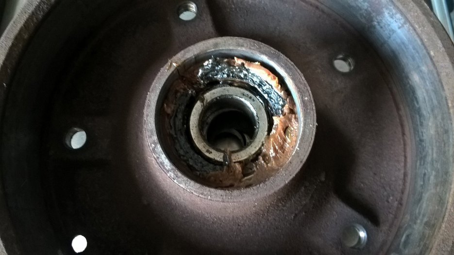 Wycisnąłem łożyska na prasie. Wyszły dokładnie w takim stanie z piasty :). Ciekawie wygląda ten smar, prawda? Zostawię to na później.