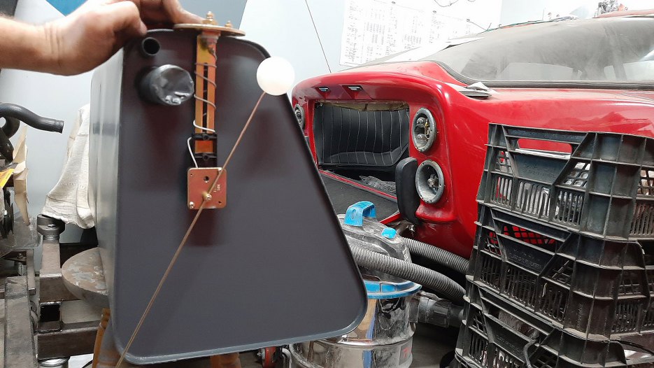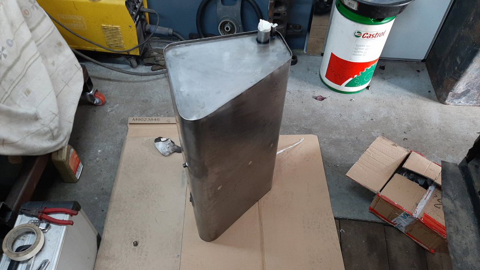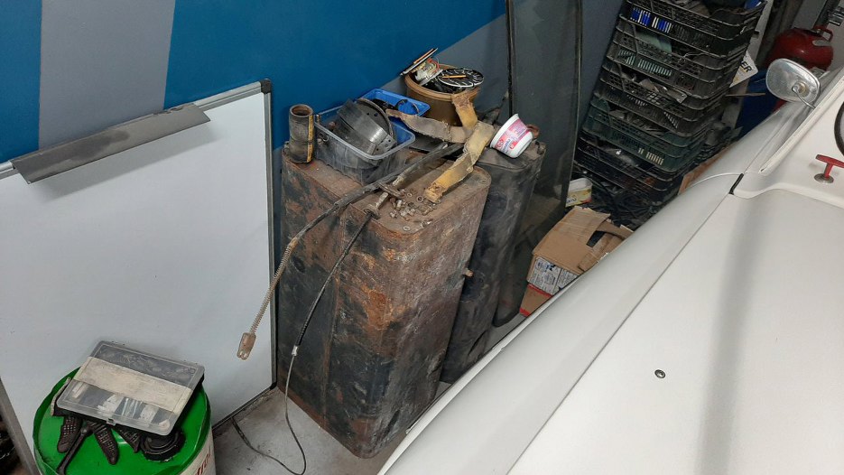 Musiałem też jakoś ugryźć temat zbiornika paliwa. Jak wyglądał możecie sobie przypomnieć --tu--. W międzyczasie własciciele przywieźli mi jeszcze zbiornik z drugiego Sonetta, z nadzieją, że może jest lepszy. Niestety oba skorodowane w środku, przy przechylaniu sporo rdzy się przewala... Odczyszczenie tego raczej było mało prawdopodobne, zwłaszcza, że w środku jest gródź, która utrudnia dotarcie do wszystkich zakamarków. Inna sprawa, że wyczyszczenie tego i ewentualne zakonserwowanie żywicą, czy coś, kosztowałoby całkiem sporo...