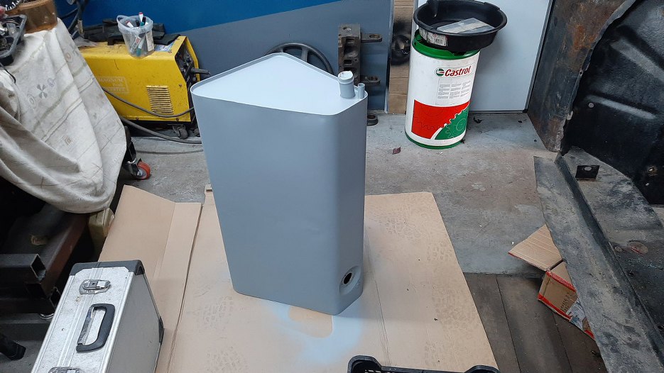 Gdy już gotowy zbiornik trafił do mnie, zabezpieczyłem go do malowania i odtłuściłem - był zapsikany WD40, żeby nie zarudział w transporcie.