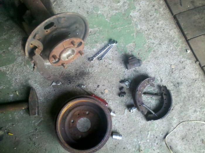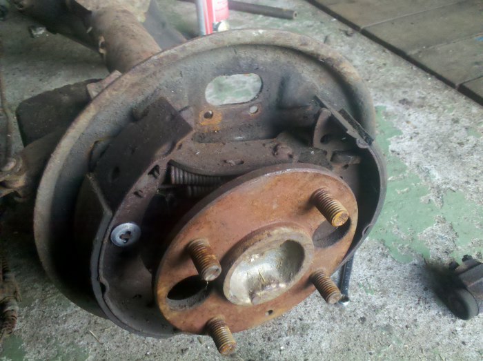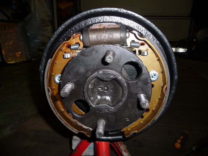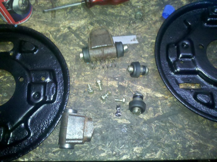 Po pomalowaniu mostu i skompletowaniu większości części do hamulców tylnych okazało się, że na moście są założone dwie lewe tarcze kotwiczne... I znowu straciłem natchnienie. Po znalezieniu odpowiednich tarcz wreszcie się wziąłem za składanie. Cylinderki były jakiś czas temu nowe, więc je rozebrałem i porządnie wyczyściłem i nasmarowałem w środku.