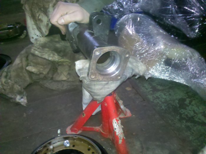 Następnie wyjąłem półosie, żeby zdjąć stare tarcze i założyć nowe. Tu znalazłem pierścień trzymający łożysko przyspawany do półosi... Póki co to zostaje, nie mam do tego drugich półosi.