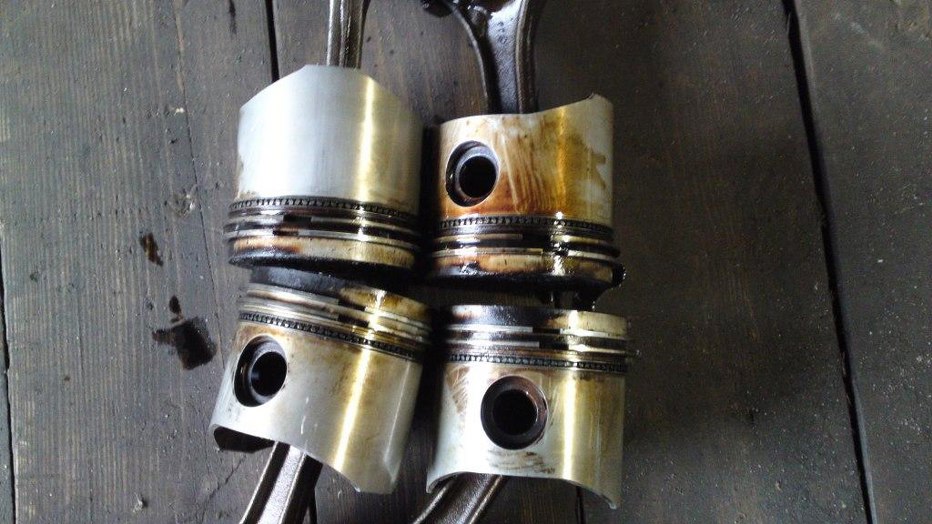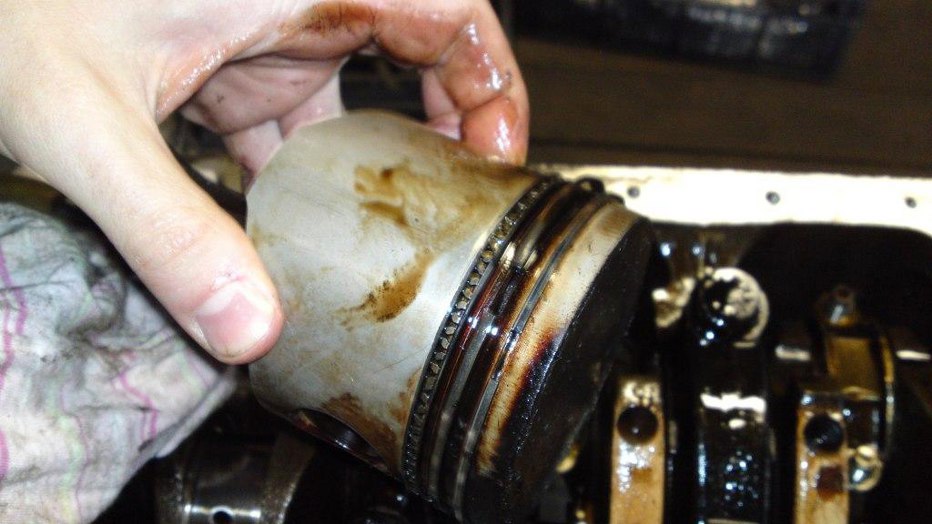 No to wyciągamy tłoki. Marker w ręku, żeby zaznaczyć jak pierścienie były ułożone, ja wyjmuję tłok delikatnie, żeby rozprężony po wyjęciu z cylindra pierścień się nie obrócił... a tu niespodzianka. Pierścień górny i środkowy mają przerwy w prawie tej samej płaszczyźnie! Trochę to Michała przybiło, ale dobra, temu nie zaznaczymy nic markerem i po sprawdzeniu przerw na pierścieniach włożymy je poprawnie.