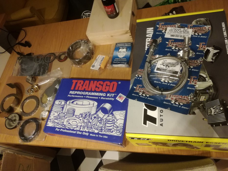 Zakupiłem, w pierwszym rzucie, rzeczy oczywiste - duży zestaw naprawczy, taśmy, miskę olejową, bagnet (bo ta skrzynia go nie miała - czyży było to potencjalne źródło wody wewnątrz skrzyni?), sprag i shift kit - tu właśnie zaprzeczyłem samemu sobie, bo widać na zdjęciu dwa zestawy, a miało być efektywnie...