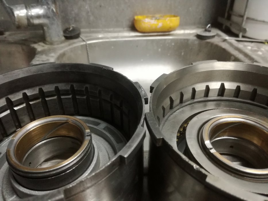 Dorwałem też bęben w lepszym stanie, ale niestety wiedza też kosztuje - nie dopytałem poprzedniego właściciela o ilość sprzęgieł, które mieści jego bęben, i mam fajny „conversation piece”. Widać po prawej, że rowek na pierścień sprężysty trzymający sprzęgiełka jest dużo niżej w nowym bębnie.