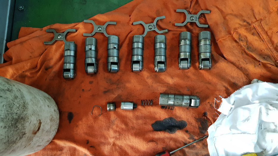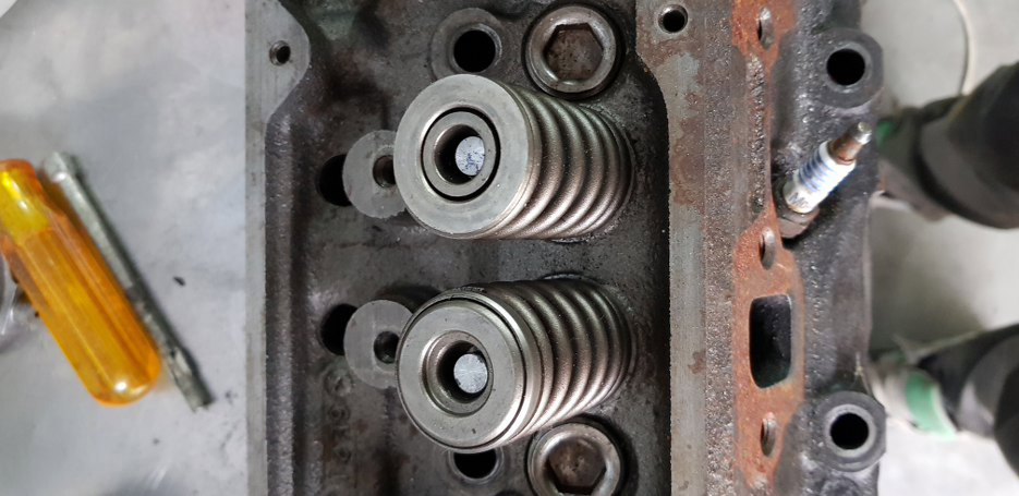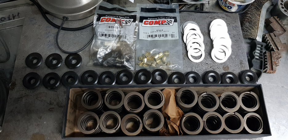 Powyższe zdjęcie może coś sugerować, ale tu problem nie jest oczywisty. Zauważyłeś, że zawory mają inne talerzyki? Pewnie przez to że jeden jest wydechowy, a drugi dolotowy - i to jest fakt, tyle że mają, przez to, wycięte takie same rowki na zamki, ale na różnych wysokościach, co powoduje że sprężyna na zaworach o różnej funkcji będzie też spięta w różnych wymiarach... Na szczęście nie ma rzeczy, których amerykanie nie rozwiążą. Dokupiłem offset’owe zamki, a w połączeniu podkładkami regulacyjnymi, które sobie dorobiłem, miałem gotowy zestaw zaworowy. Uufff... Dużo tego...