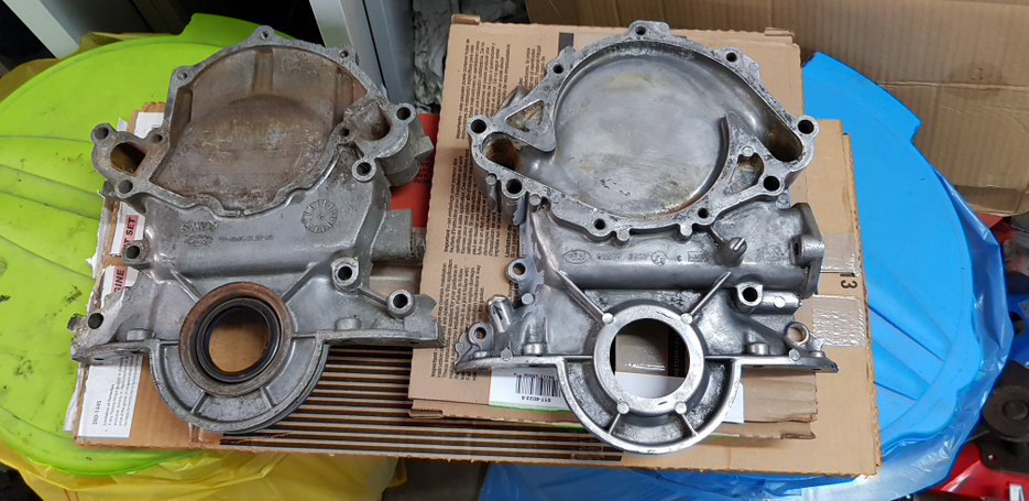 W związku z tym, iż chciałbym by silnik zasilał gaźnik, postanowiłem zakupić pokrywę łańcucha rozrządu z wyjściem na mechaniczną pompę paliwową. Tu widać subtelną różnicę między późną pokrywą, a tą dokupioną.