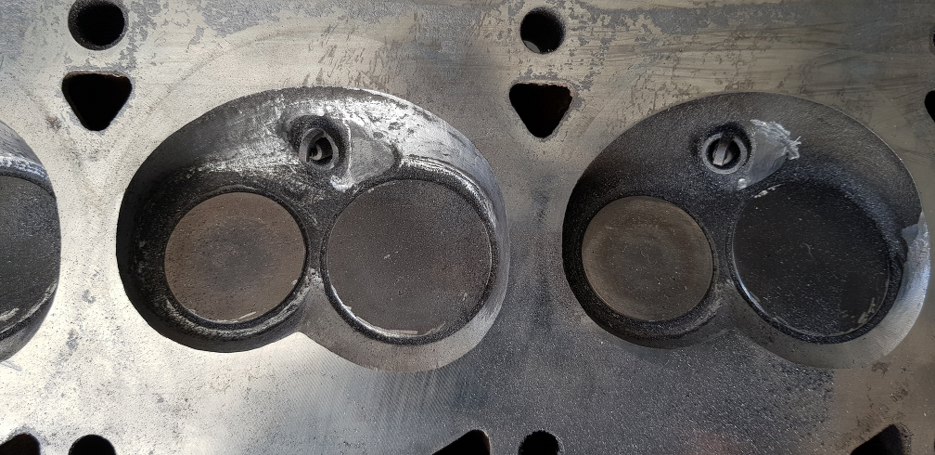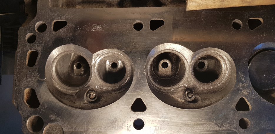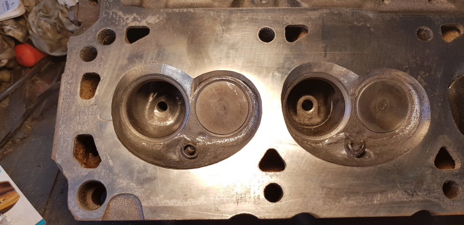 Do tego głowice E6SE mają, moim zdaniem, komorę spalania która pogłębia jeszcze bardziej ww. problem. Na pierwszym planie widać dziewiczą komorę spalania, na dalszym planie pierwsze przymiarki do „oswobodzenia” dolotu. Zwróć uwagę jak duża część obwodu zaworu jest „obudowana” ściankami komory spalania.