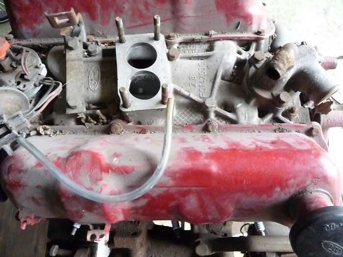 Z tego co wcześniej było wiadomo o silniku, to że kiedyś był zdaje się na wtrysku, a został przerobiony na gaźnik. Podejrzewaliśmy z Michałem, że, jak to zazwyczaj bywa, został założony kolektor i gaźnik od silnika 2.3 (kolektory i gaźniki od 2.8 są dość trudne do zdobycia i drogie - były tylko w granadach i tylko przez rok, czy dwa). Niespodzianka jest taka, że jest i kolektor i gaźnik od 2.8. Gaźnik co prawda ma przepustnice, które się nie ruszają, ale to się przecież naprawi :)