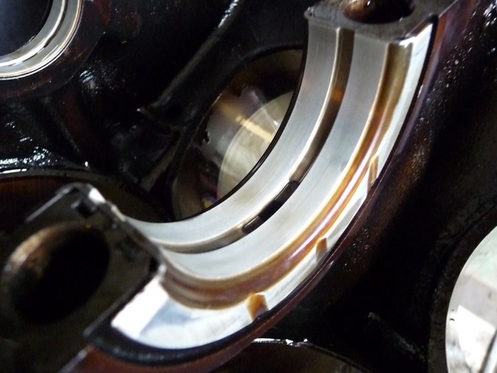 Panewki główne idealne, korbowe bardzo dobre, nic tylko składać i jeździć. Chwila, tylko wał korbowy jakiś taki porysowany... Ciekawe, czy taki został włożony na nowe panewki, czy porysował się później. Tak czy inaczej jedzie do szlifierni na sprawdzenie, czy polerka wystarczy, czy pełen szlif robimy.