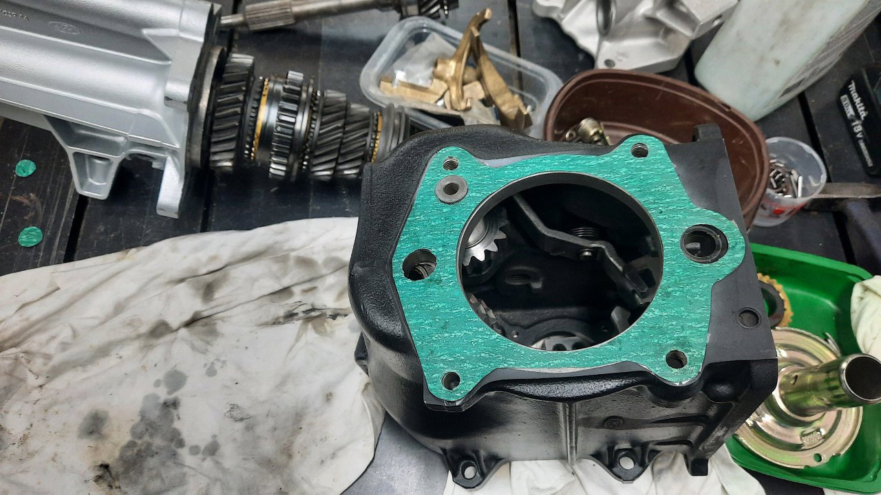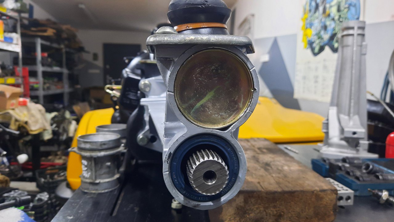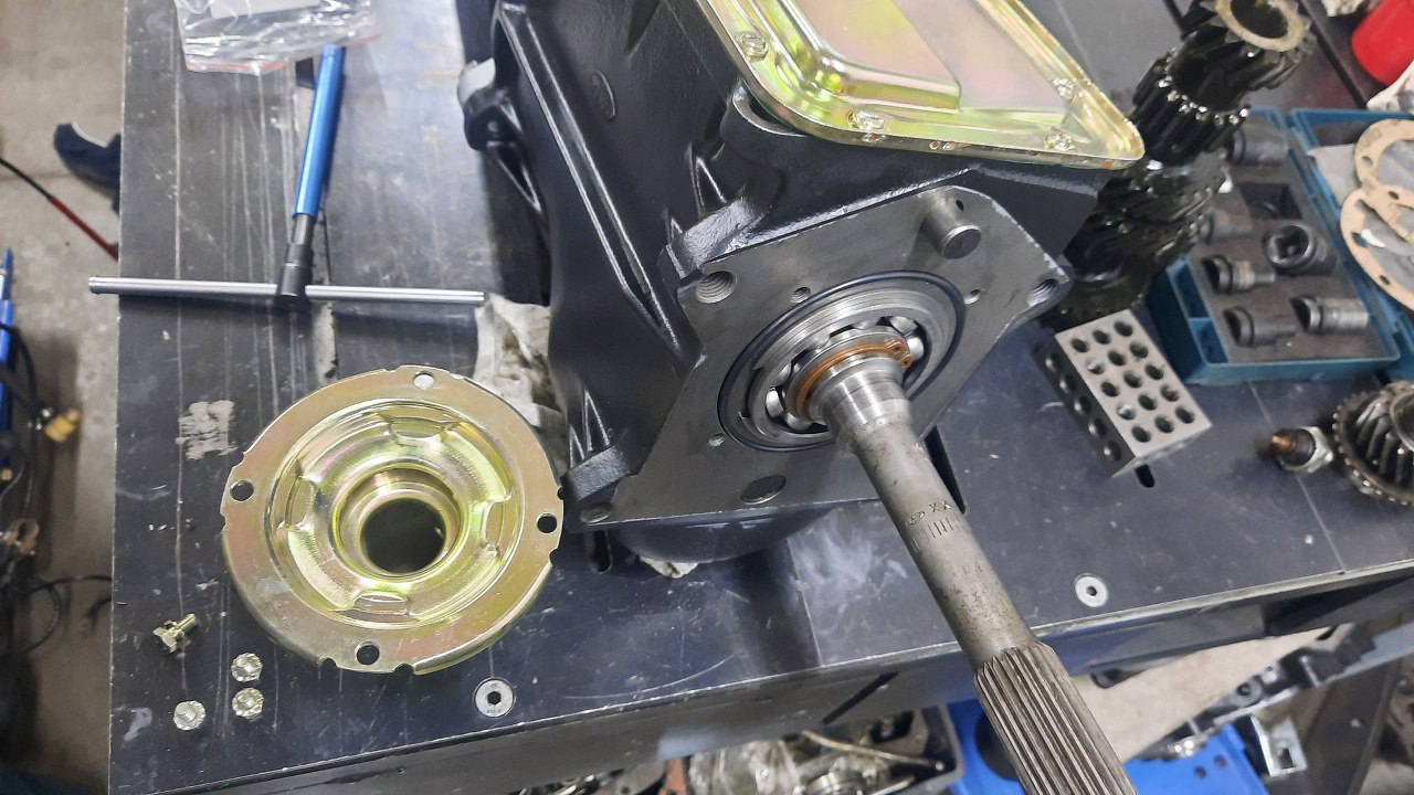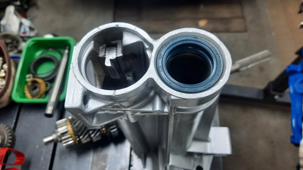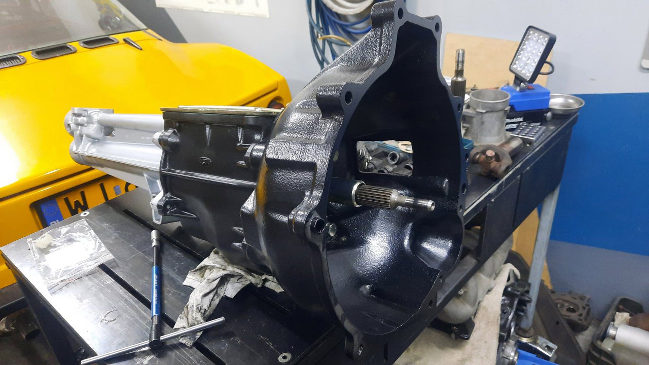 Skrzynia gotowa. Zostawiłem otwarte miejsce na zębatkę napędu prędkościomierza, żeby można ją było zmienić w zależności od tego, do auta z jakim przełożeniem tylnego mostu trafi.