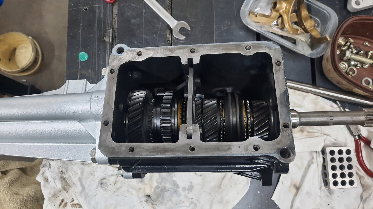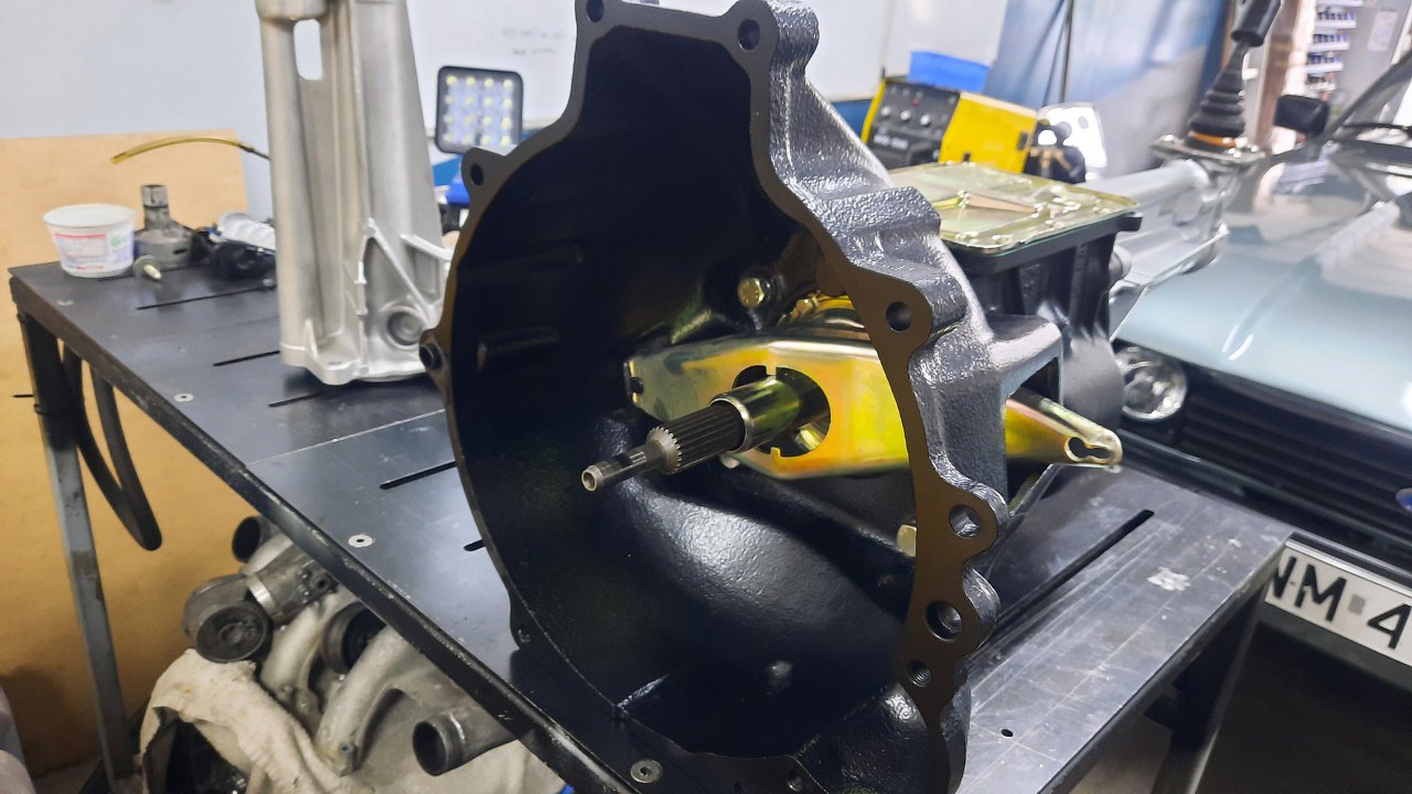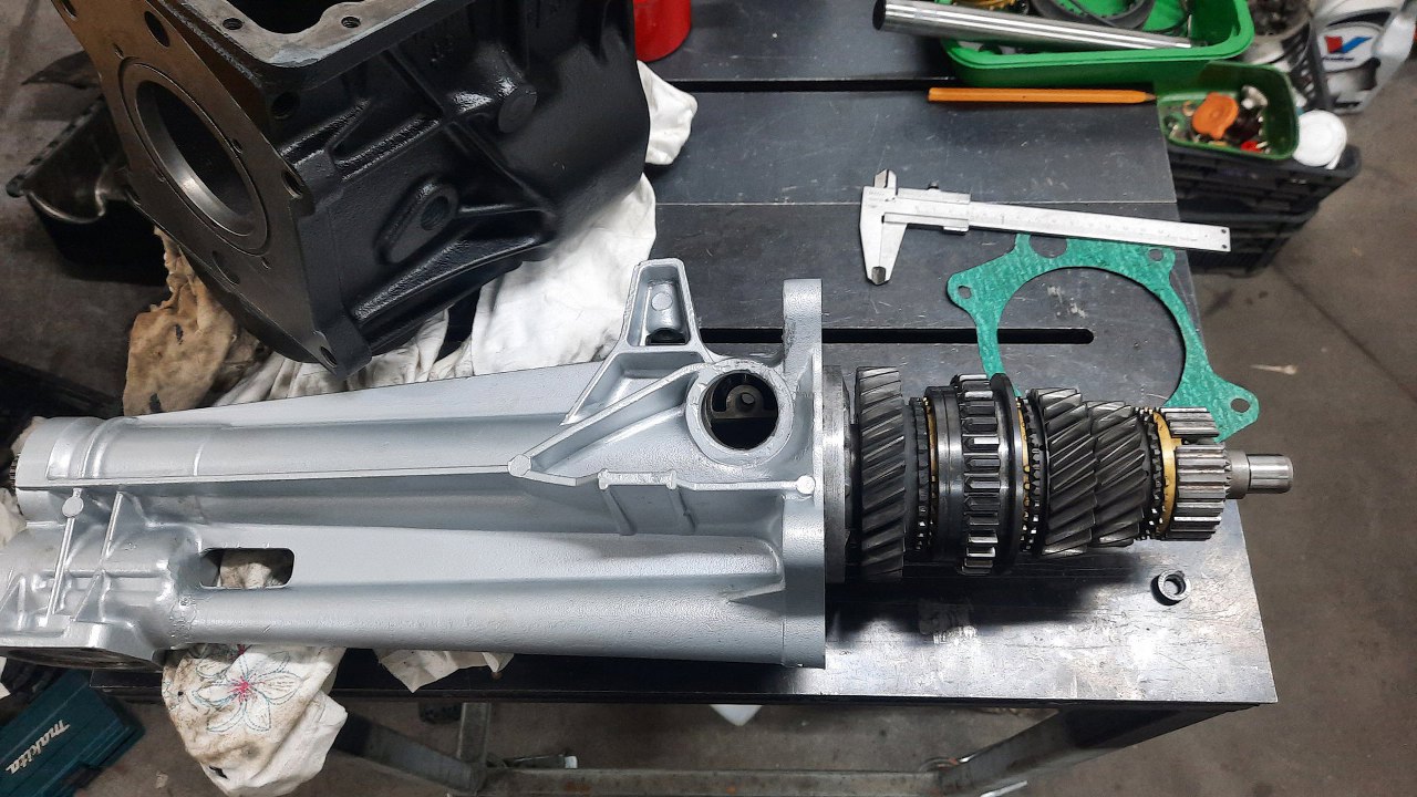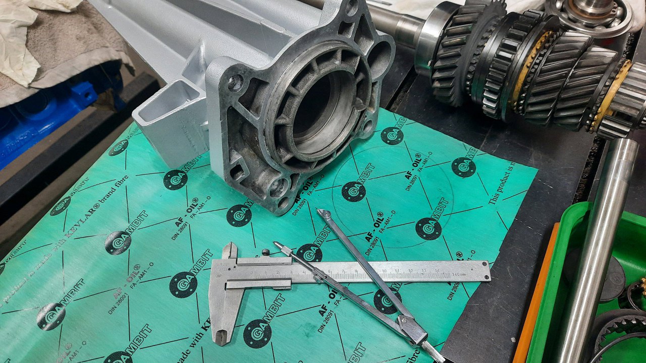 Skrzynia gotowa. Zostawiłem otwarte miejsce na zębatkę napędu prędkościomierza, żeby można ją było zmienić w zależności od tego, do auta z jakim przełożeniem tylnego mostu trafi.