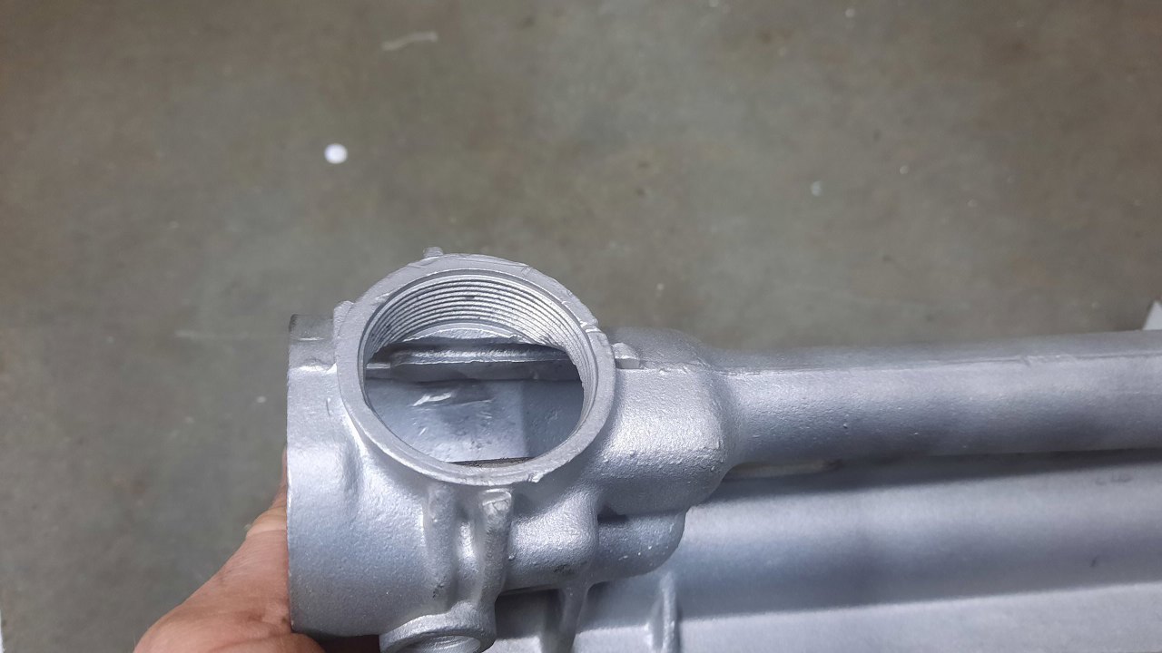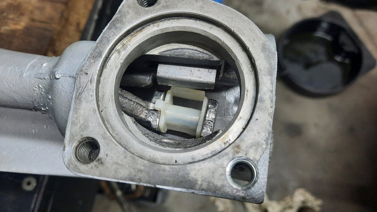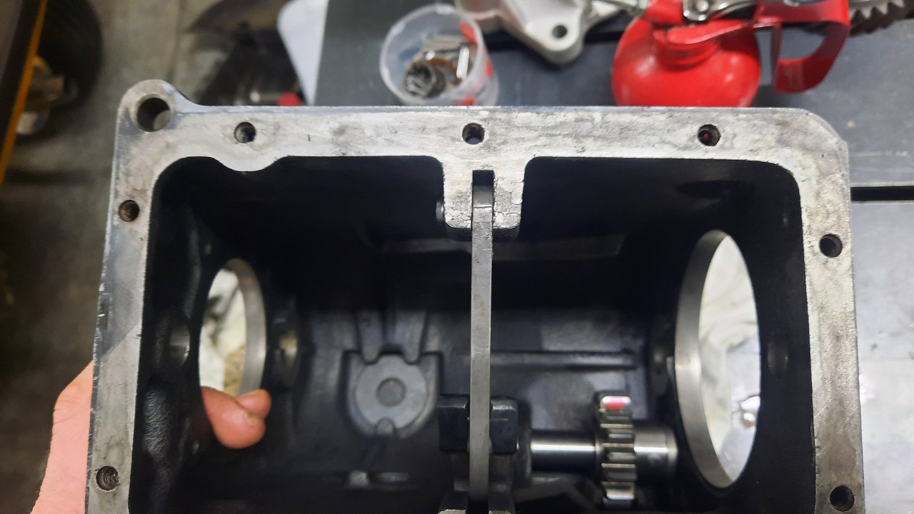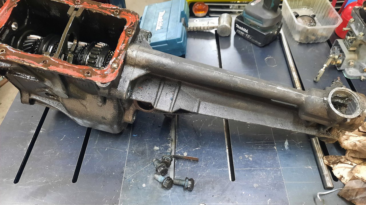 Trafił mi się jednak ogon od nowszej wersji tej skrzyni, już po zmianach. Sama skrzynia nie została zmieniona, ale ogon dostał dźwignię biegów mocowaną na trzy śruby. Zdecydowanie lepsze rozwiązanie. Jeden z gwintów był tu zerwany, więc wstawiłem tu helicoila.