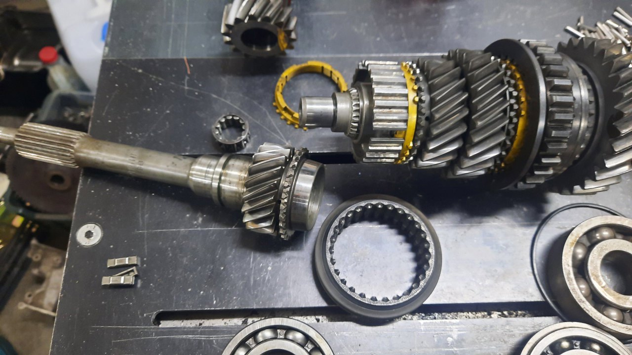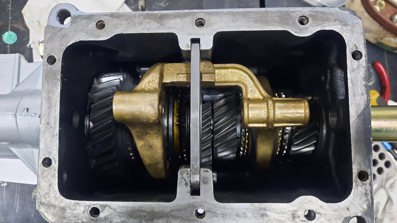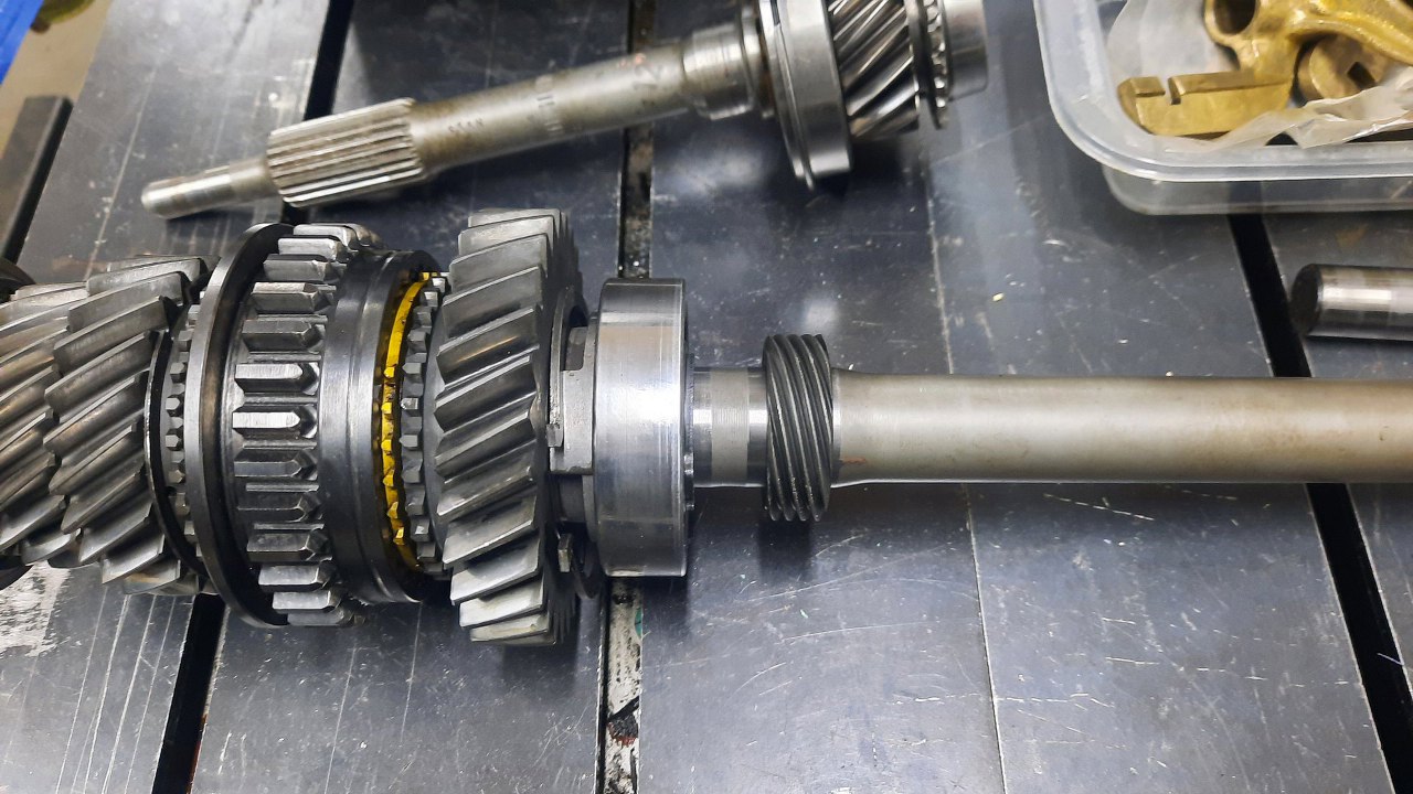 Zdjęte. Po wyjęciu całości z ogona skrzyni, pierwszy bieg zdejmuje się w stronę tyłu skrzyni.