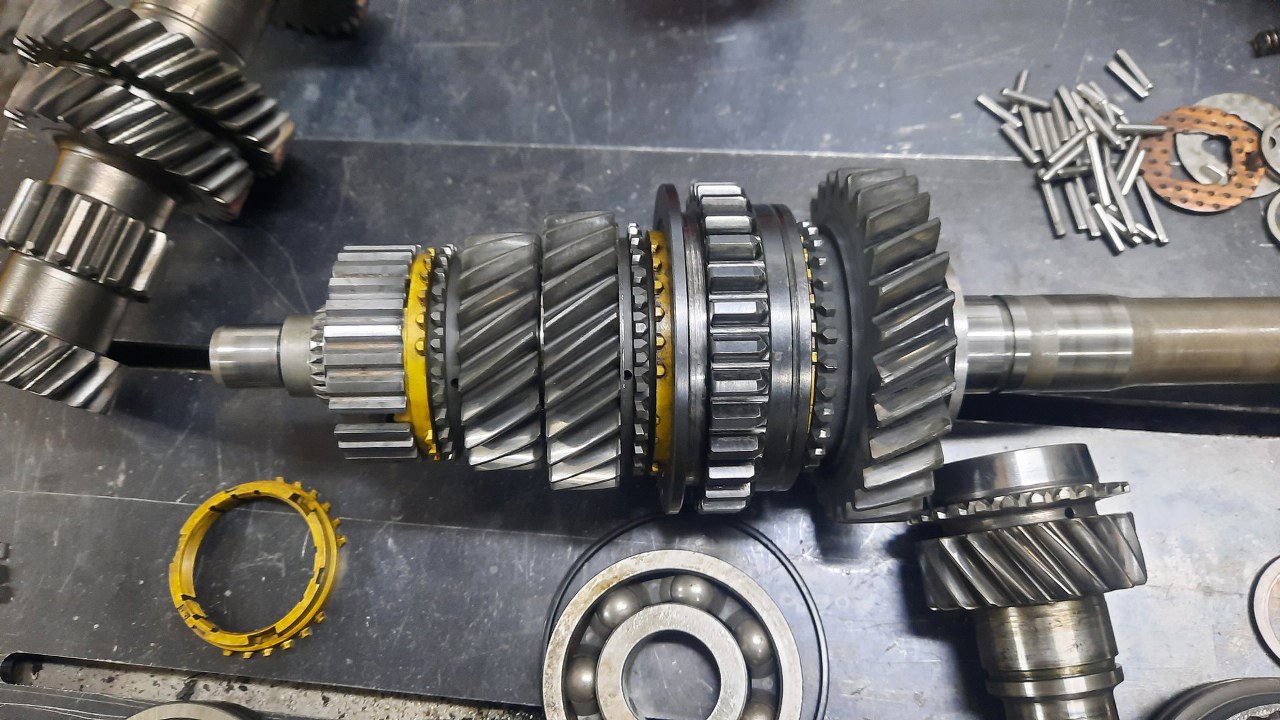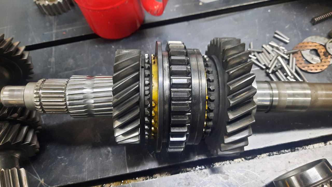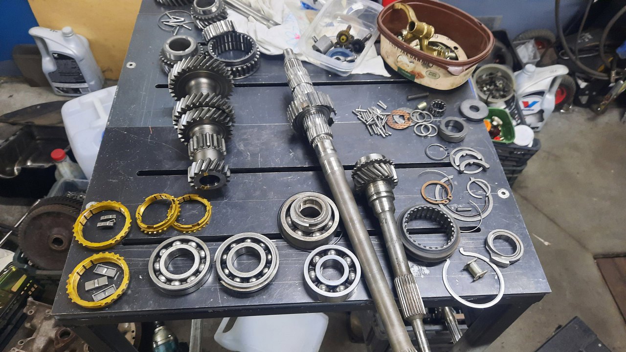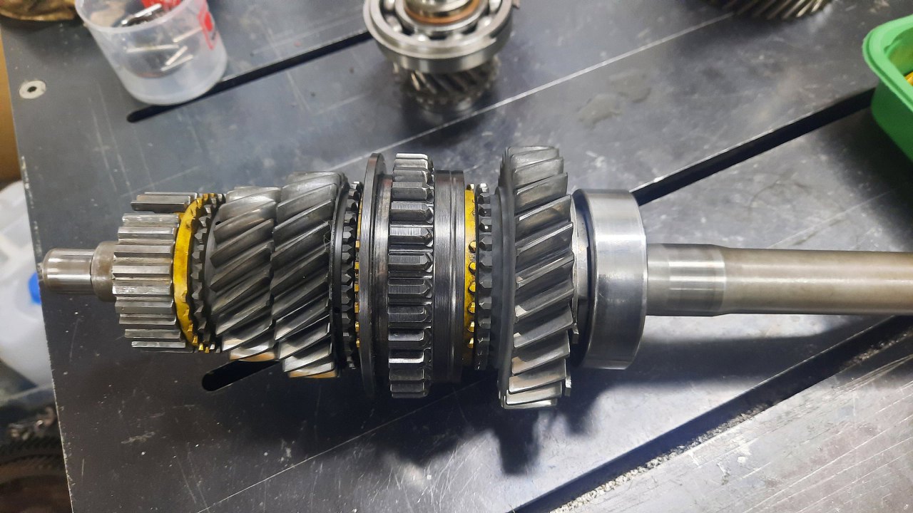 Zdjęte. Po wyjęciu całości z ogona skrzyni, pierwszy bieg zdejmuje się w stronę tyłu skrzyni.