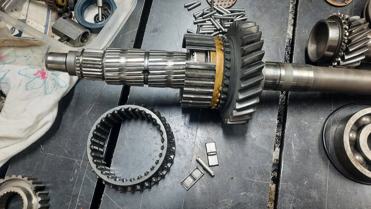 Zaczynam więc składać skrzynię. Włożyłem zębatkę pierwszego biegu i szykuję przesuwkę z zębatką wstecznego biegu. Synchronizatory są w idealnym stanie.