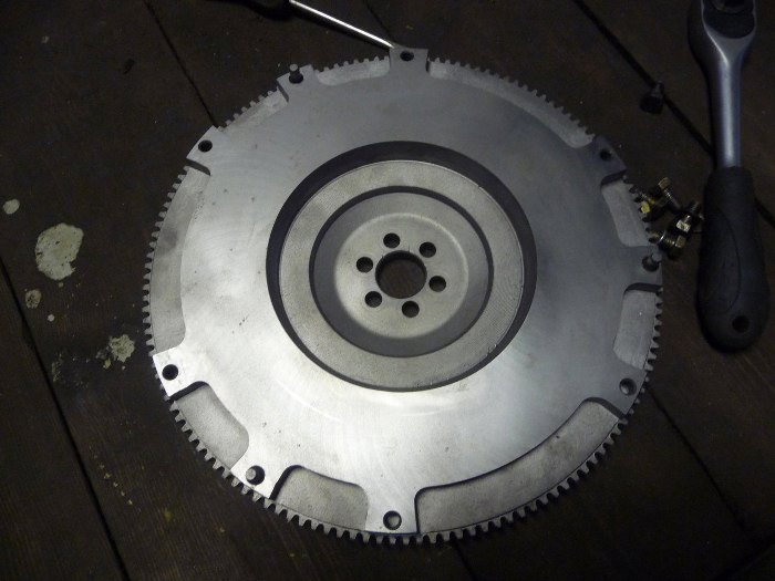 Następne w kolejce było koło zamachowe. Zostało ono dość drastycznie odchudzone. Ostała się w całości tylko płaszczyzna przylegania tarczy i punkty mocowania.